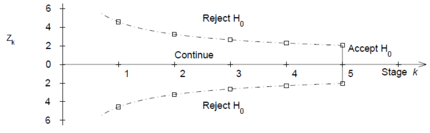 - First interim analysis compare test statistic to critical value Z1 |> c1. If significant then stop the trial.