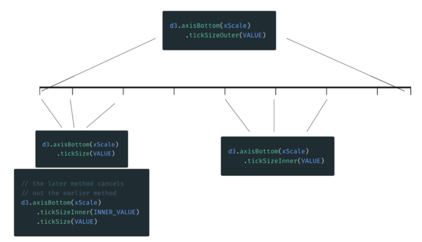 tickSizeOuter only changes outermost ticks, tickSizeInner only changes inner ticks, tickSize effects all of them equally. Using tickSize along with the inner or outer adjuster will make the last one called count.